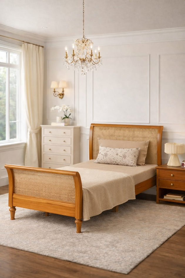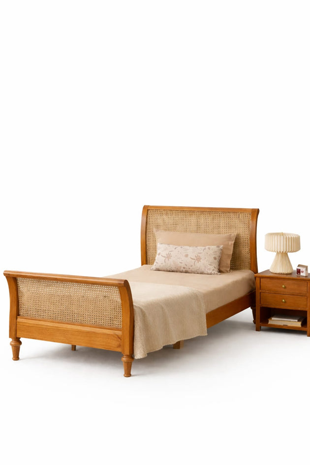 Artisan Heritage Solid Teak Wood & Natural Woven Cane Sleigh Bed Frame