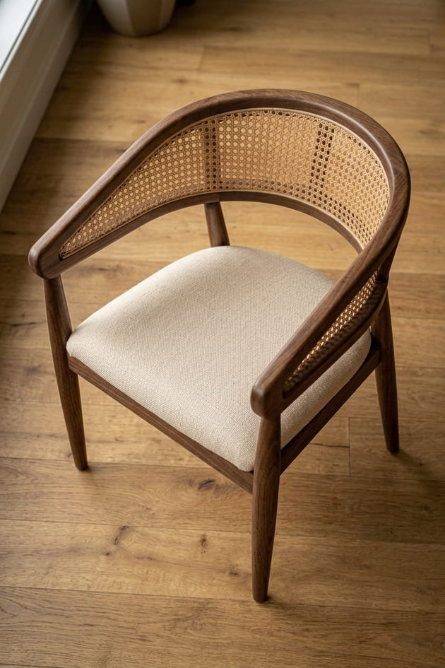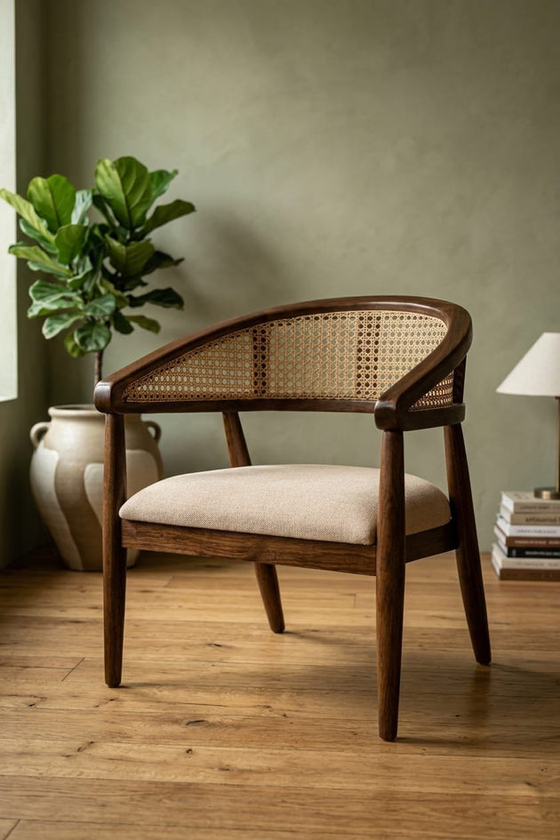 Handcrafted Solid Wood Cane Accent Chair with Elegant Fabric Cushion