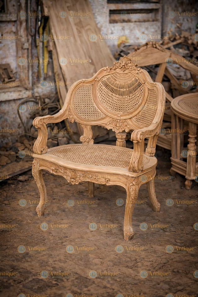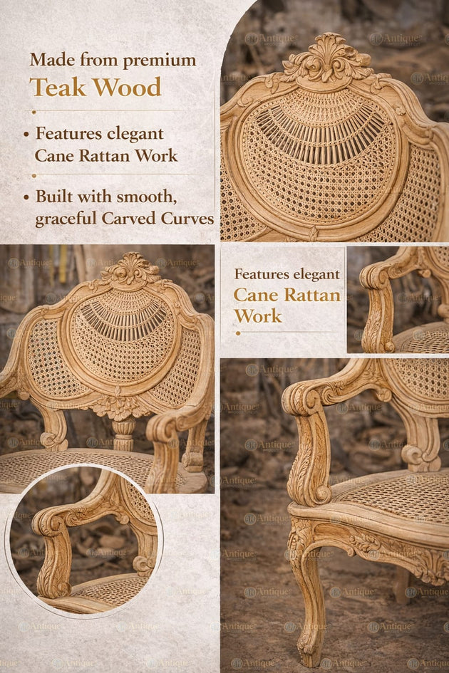 Hand-Carved Solid Teak & Natural Cane Rattan French Provincial Accent Chair