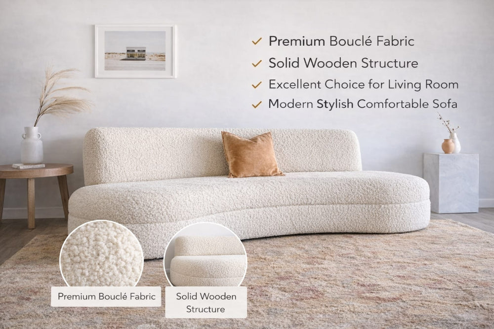 Upholstered in premium textured bouclé fabric, the sofa offers a cozy yet refined feel. The gently curved form creates a welcoming seating experience while adding a designer touch inspired by modern European interiors. Its neutral cream tone complements a wide range of décor styles—from minimal and Scandinavian to modern luxury and earthy interiors.