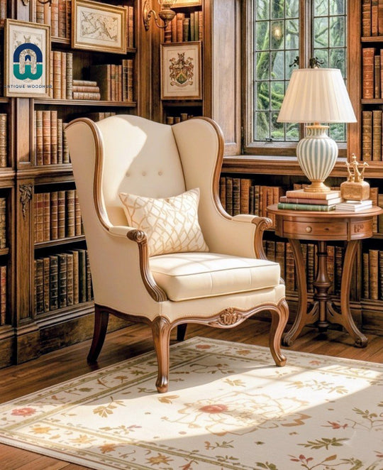 Luxury Wingback Accent Chair with Hand-Carved Sheesham Wood Frame | Premium Upholstered Classic Armchair